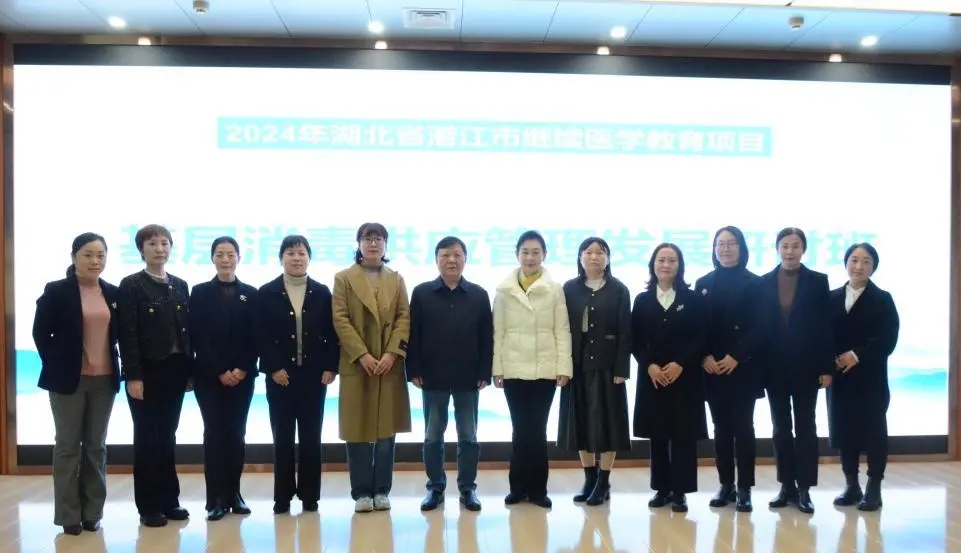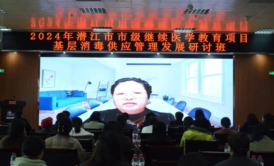 副院长廖新标、院长助理宋小青、院感办主任彭俊、护理部主任袁彩蓉、护理部副主任刘明红及潜江市多家医疗机构消毒供应中心护士长等200余人参加了线下授课。