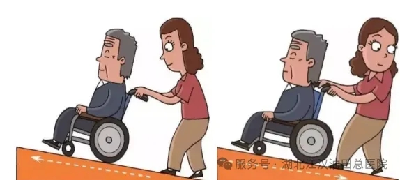 使用轮椅上坡,身体前倾,重心前移,面朝前进方向执行,防止后翻。