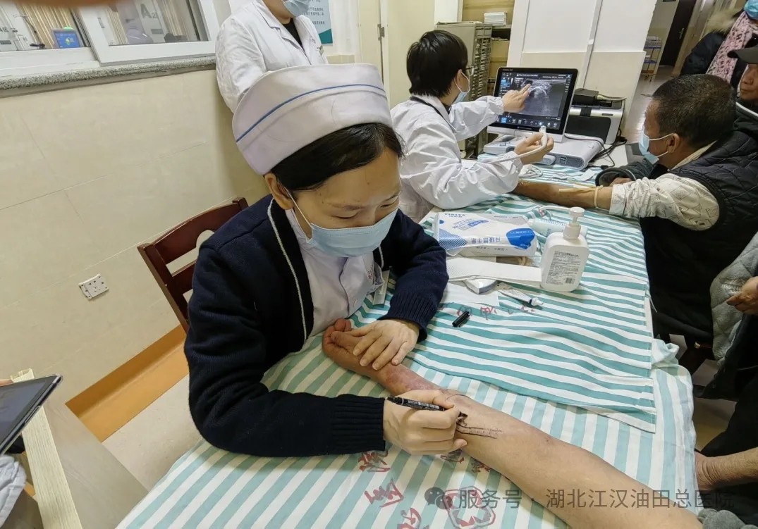 血透室护士长欧阳梅耐心查看肾友的内瘘情况。她根据每一位肾友的血管条件制定个性化的穿刺计划,并绘制图谱。这样做,不仅能更好地保护内瘘、提高透析效果,还能减轻肾友痛苦,有效地避免内瘘并发症。