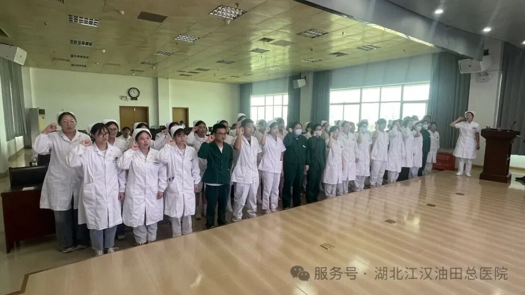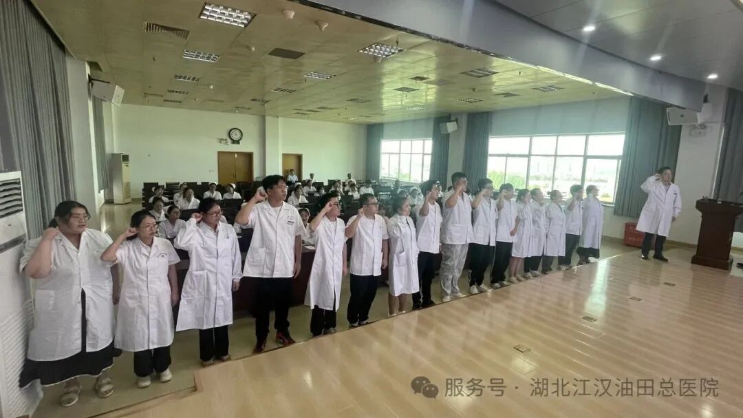 在随后的宣誓环节,69名新员工着装整齐,面向中国医师宣言和南丁格尔誓言庄严肃立。“我志愿献身人类的健康事业,自觉维护医学的尊严和神圣……”“余谨以至诚,终身纯洁,忠贞职守……”铿锵有力的医师誓言与南丁格尔誓言交替回响,不仅是新员工对职业理想的郑重承诺,更凝聚着他们对生命的敬畏、对职责的坚守,标志着这群医疗新生力量正式接过守护健康的“接力棒”,迈向践行医者使命的全新征程。