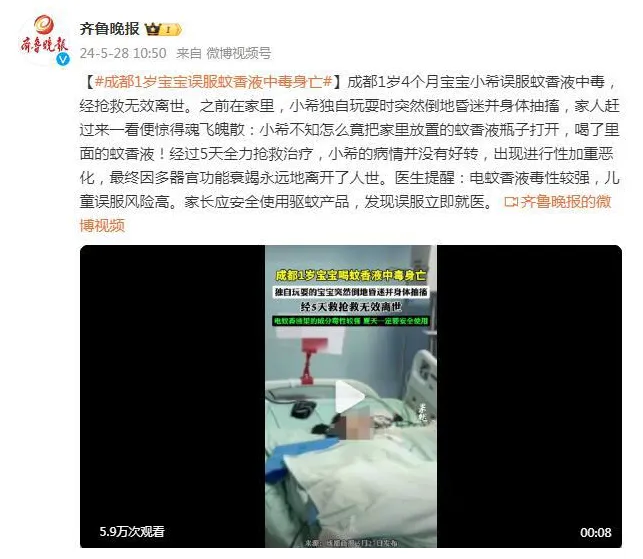 近日,成都1岁宝宝误喝蚊香液中毒,经抢救五天后因多器官功能衰竭不幸离世。医生提醒:蚊香液属农药,有毒!