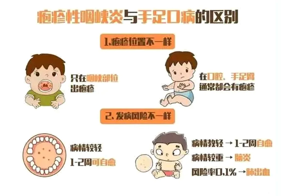 疱疹性咽颊炎的疱疹仅出现在口腔内,而手足口病以口腔黏膜疱疹或溃疡、手、足、臀等部位皮肤出疹为主要特征。
