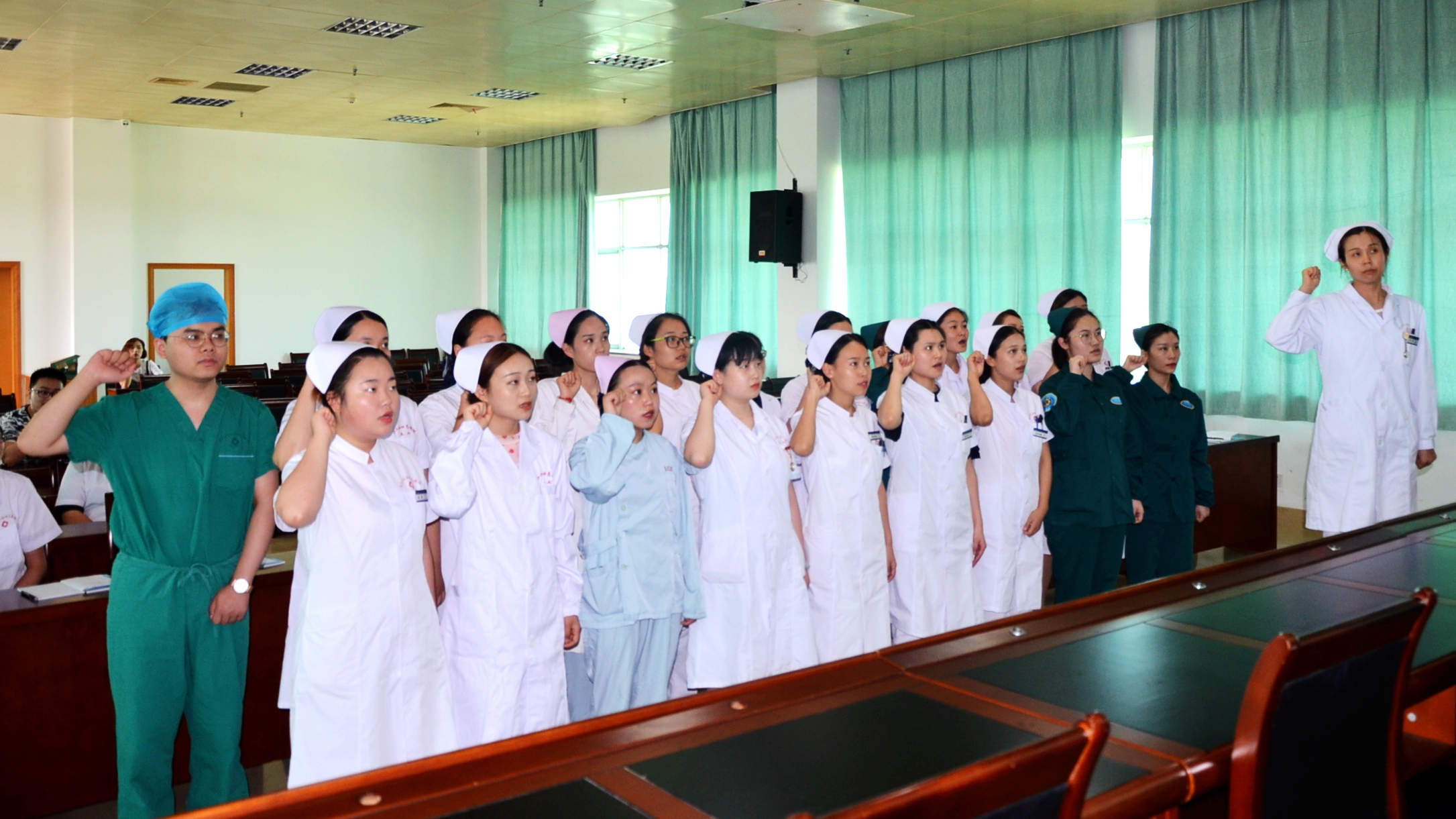 (下图:新入职护士在消化内科护士长李群引领下面对《南丁格尔誓言》宣誓。)