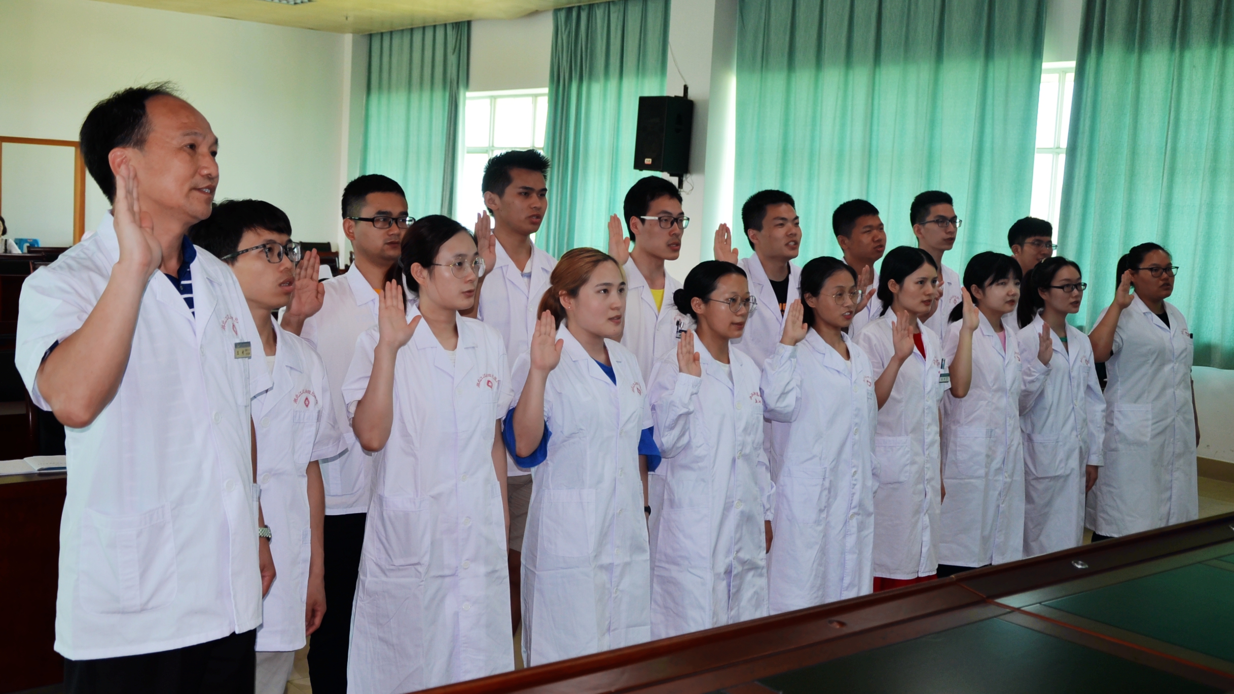 (下图:新入职医生在医务部主任王彬引领下面对《中国医师宣言》宣誓。)
