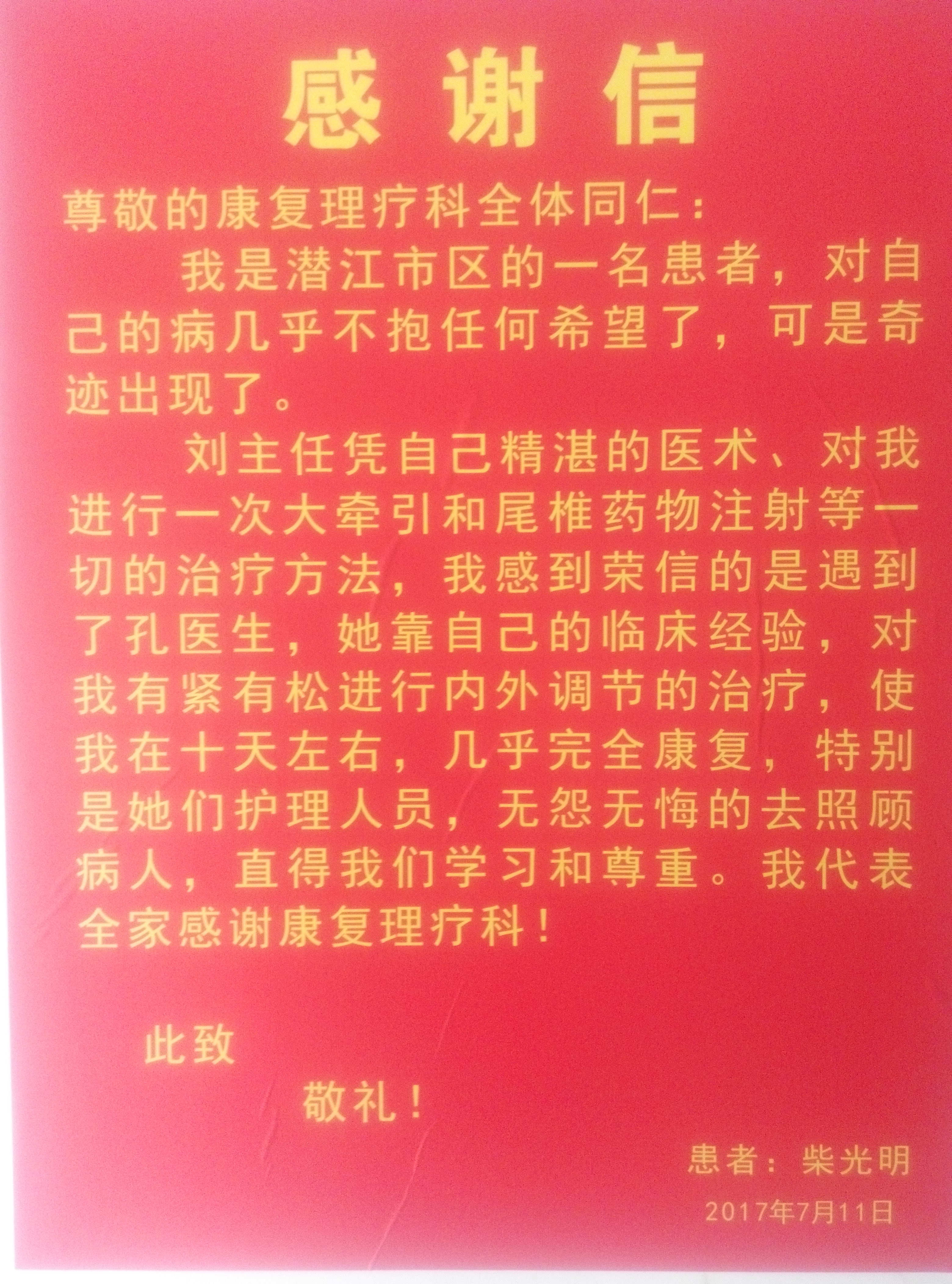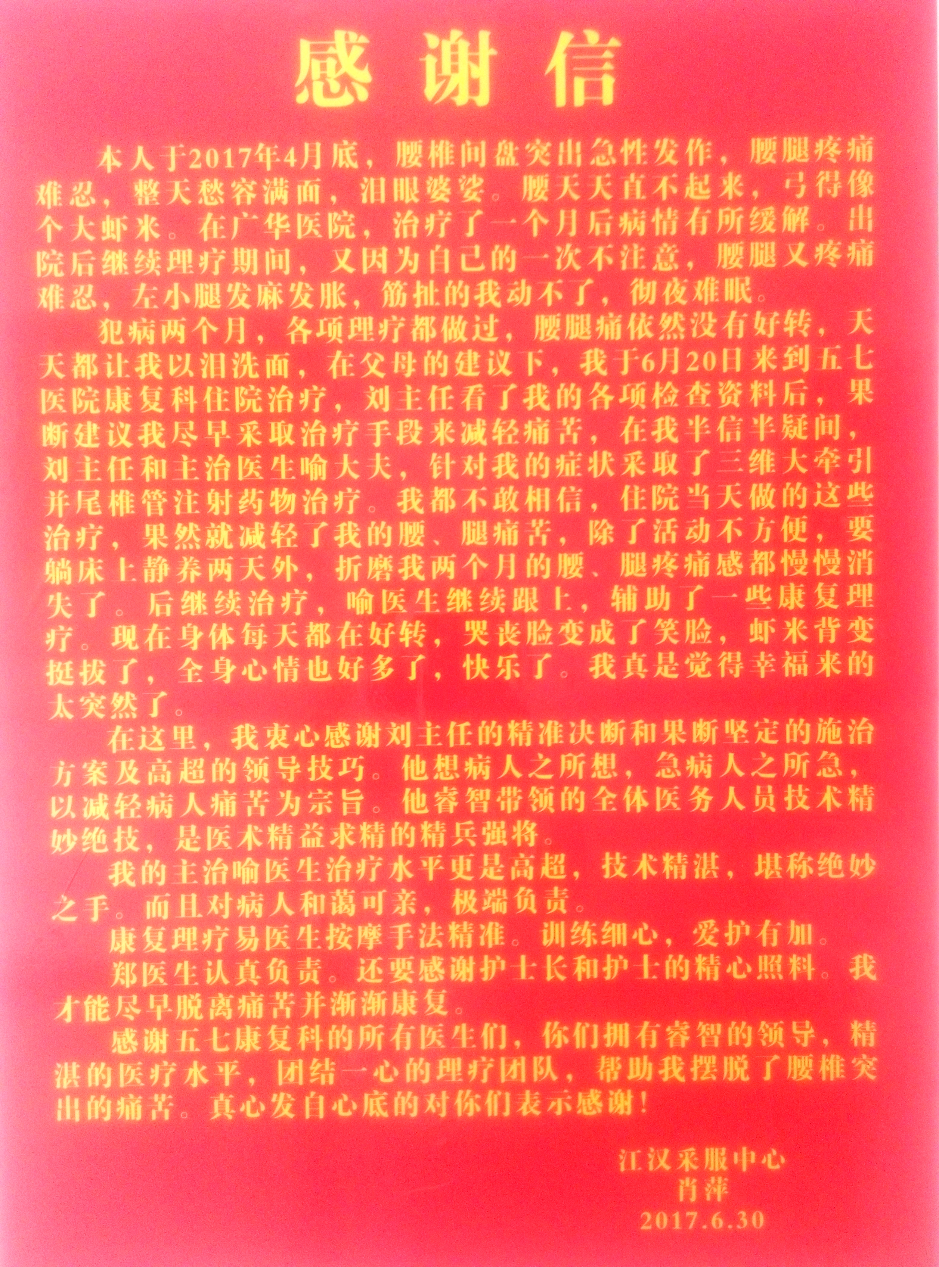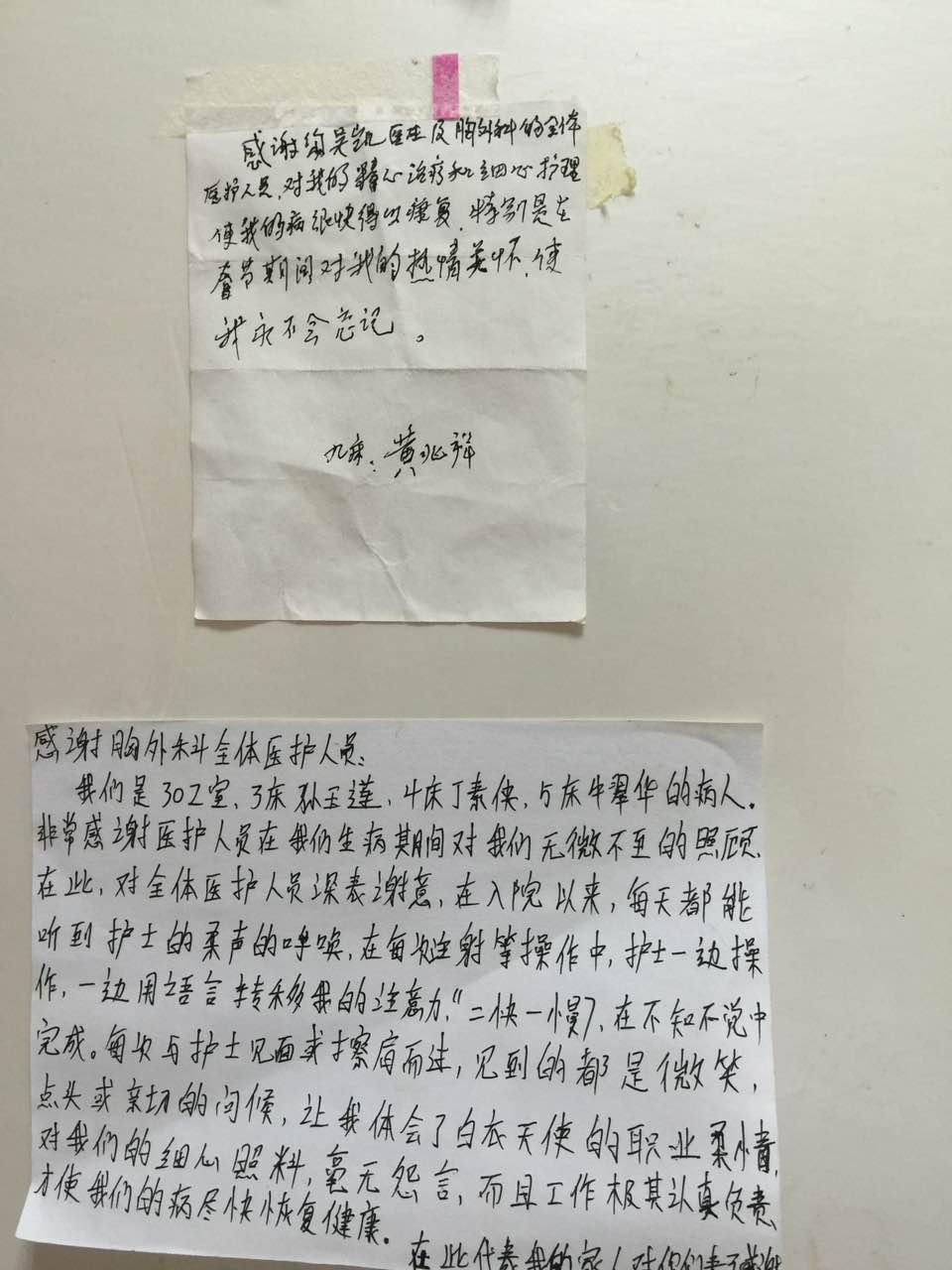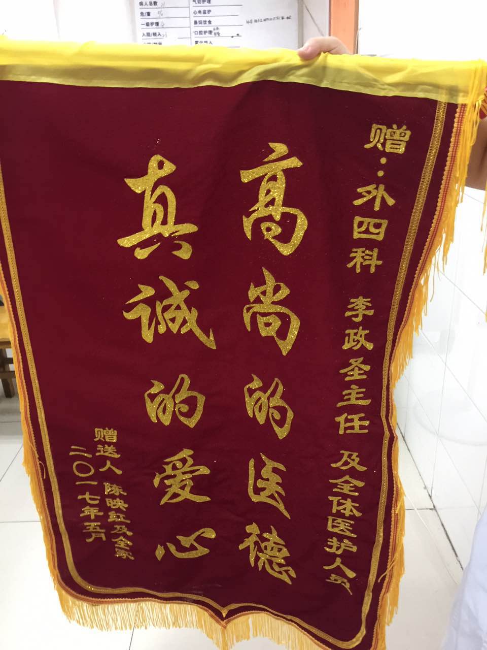 近日,部分患者向我院临床科室医护人员送来了锦旗与感谢信。患者与家属在锦旗与感谢信中表达了对我院医务人员精湛的专业知识技能、崇高的工作责任感、敬业的工作精神、热情的工作态度的敬佩与感激。现将其公示,以兹鼓励。