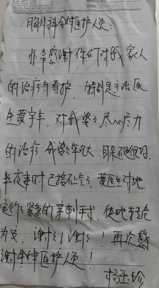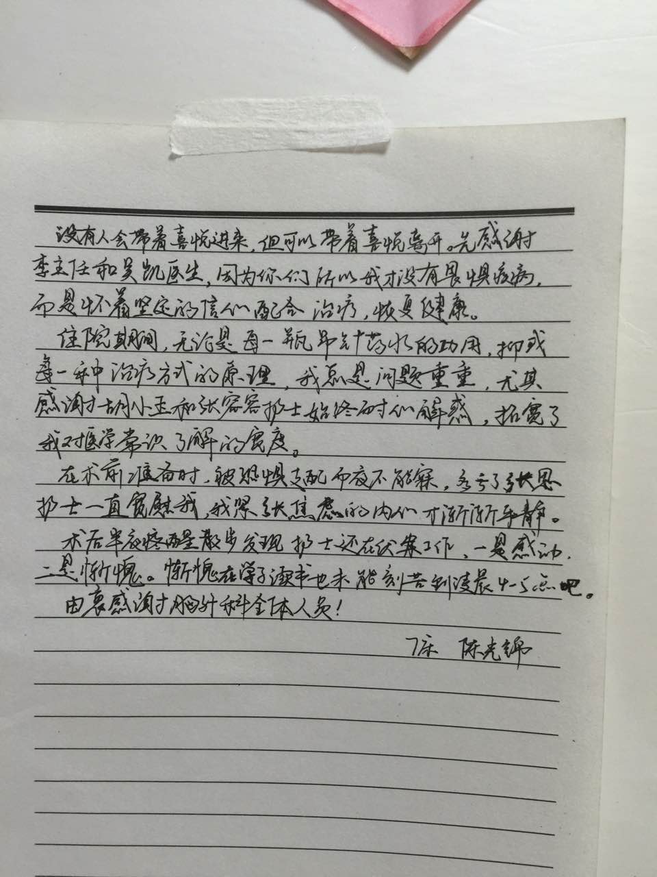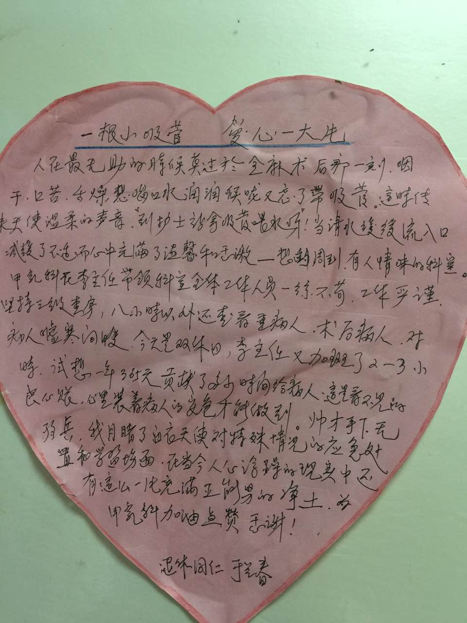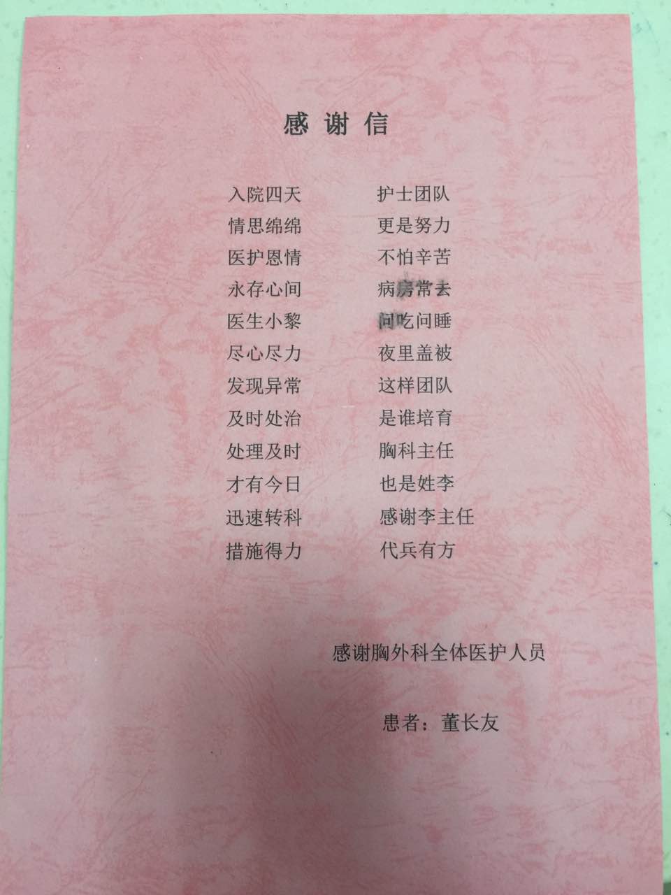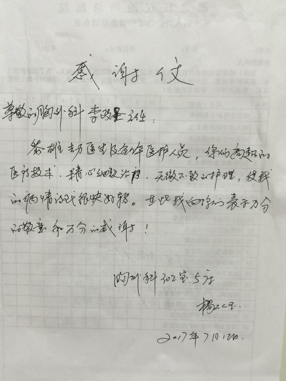 近日,部分患者向我院临床科室医护人员送来了锦旗与感谢信。患者与家属在锦旗与感谢信中表达了对我院医务人员精湛的专业知识技能、崇高的工作责任感、敬业的工作精神、热情的工作态度的敬佩与感激。现将其公示,以兹鼓励。