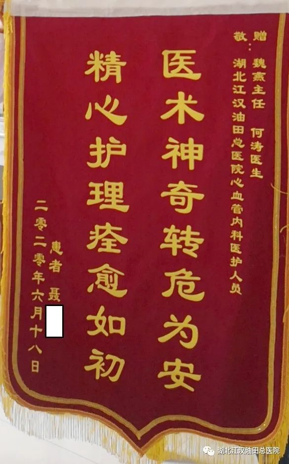6月20日,心梗患者聂先生经油田总医院心血管内科医护人员全力救治痊愈出院。这天,患者聂先生委托家属给油田总医院心血管内科送来一面鲜艳的锦旗,“医术神奇转危为安,精心护理痊愈如初”,表达了患者及其家属对油田总医院医护人员的一份敬意和感激之情。