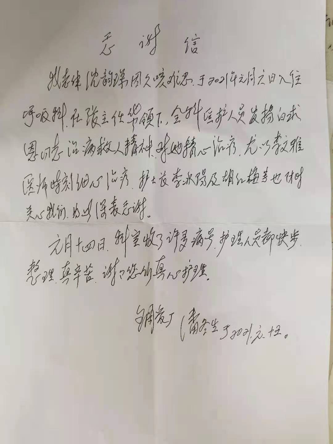 呼吸与危重症医学科住院患者向科室赠送感谢信。