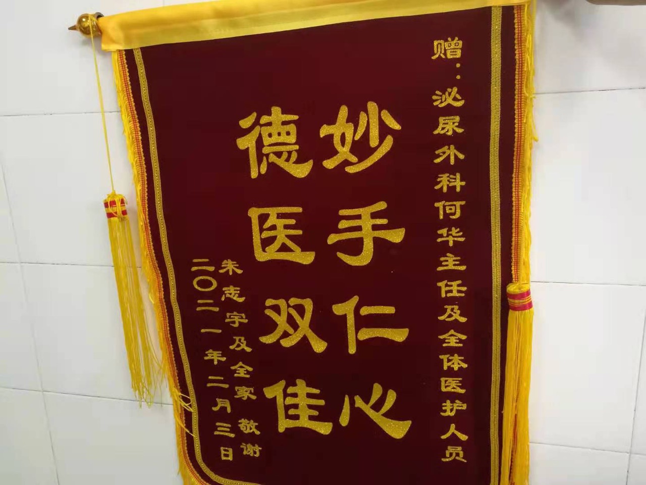 泌尿外科住院患者22床(朱*宇),住院号1006436*向科室赠送锦旗。