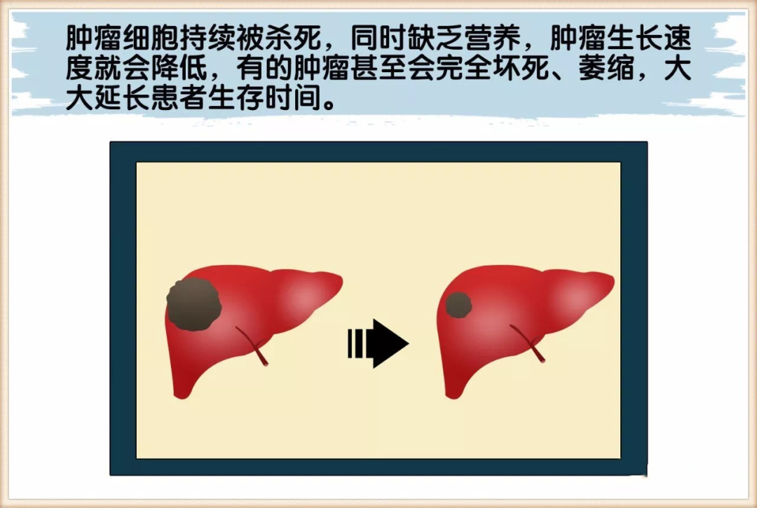 使用特制的导管放在肿瘤或出血的供血动脉,直接注射化疗药物和栓塞药物,在杀死肿瘤细胞的同时,让肿瘤没有营养供应。