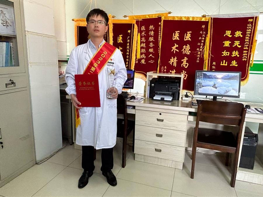 在他那不大的办公室内,墙上挂满了患者送来的一面面锦旗。作为江汉油田总医院内分泌肾内科主治医师,他每天奔波在一线,解决复杂病症。从2014年参加工作以来,他坚持医者父母心,对待患者如同亲人。为了方便对慢病患者长程管理,他把自己的手机号码主动留给患者,24小时开机,无论何时都耐心接听每一位患者的来电,十年如一日,默默守护着百姓的健康。