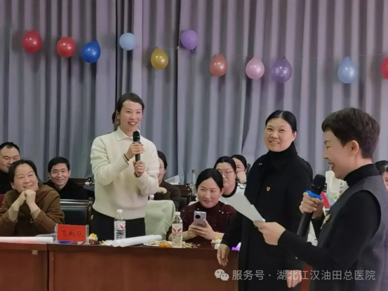 “服务意识视频抢答找茬”环节颇具巧思,将职业素养融入娱乐,大家敏锐指出情景短片中服务细节的可优化之处,在轻松互动中深化“以患者为中心”的服务理念。“一人比划一人猜”环节,医学术语与生活词汇交错,比划者全力展现、猜词者时而顿悟,台上台下互动热烈,欢乐氛围拉满。