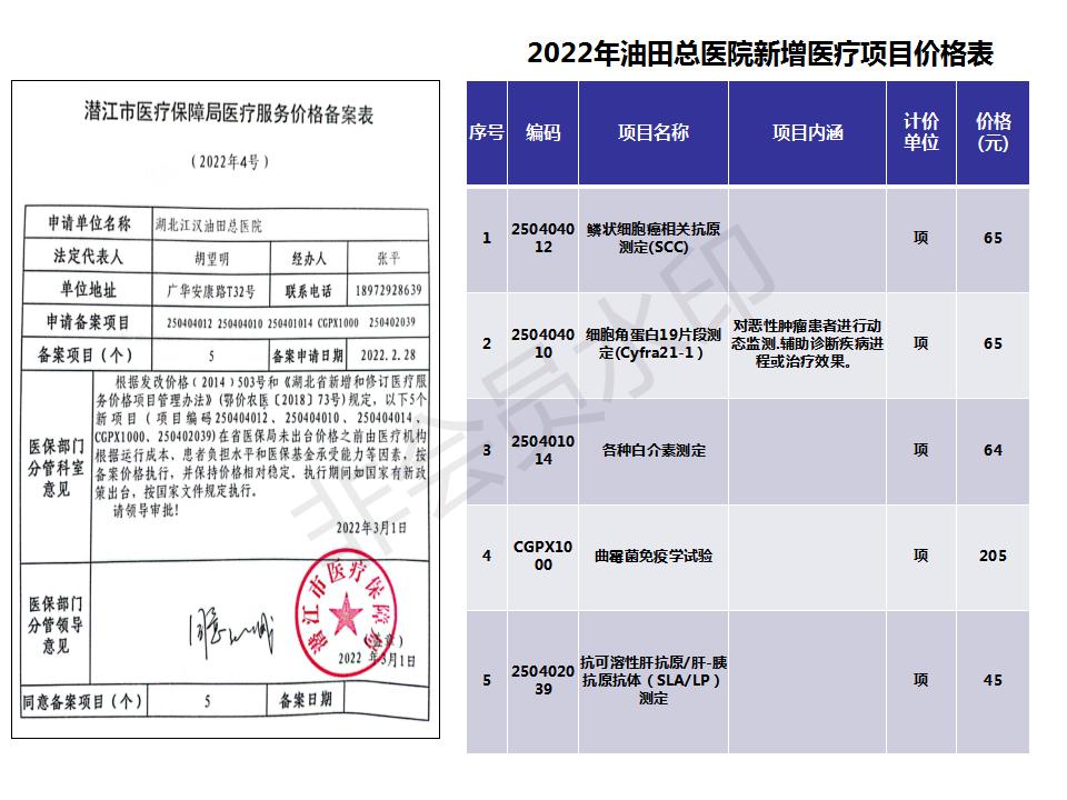 2022年油田总医院新增医疗项目价格表