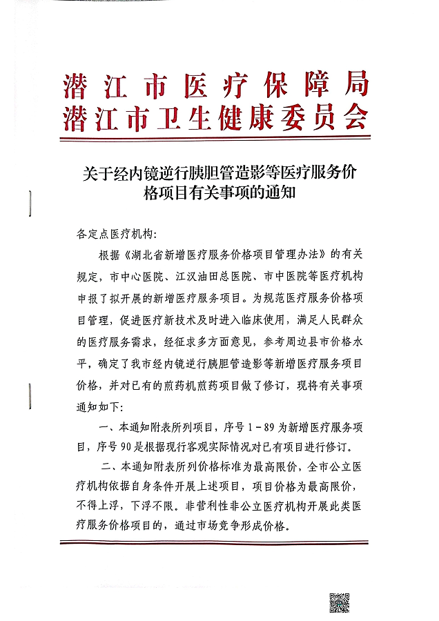 关于经内镜逆行胰胆管造影等医疗服务价格项目有关事项额的通知.