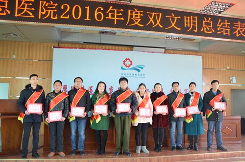 大会在雄壮的国歌声中拉开帷幕。院长雷正秀宣读了《总医院二O一六年度双文明工作成果通报》。报告从主要医疗指标、医疗质量、复审工作、医疗技术、医疗服务、科研教学、医疗条件、公共卫生服务、医院管理、支持保障系统、党建和思想政治工作11个方面概述了院二O一六年双文明建设成绩。院党委副书记、纪委书记、工会主席陶银保宣读《关于表彰二O一六年度双文明先进集体和个人的决定》,并通报了受管理局表彰的双文明先进集体和个人以及受局党委表彰的思想政治工作先进集体和个人。随后,在欢快的音乐声中,院领导为5个双文明科室、3个思想政治工作先进集体、10名劳动模范、50名双文明先进个人及5名思想政治工作先进个人颁发了荣誉证书。