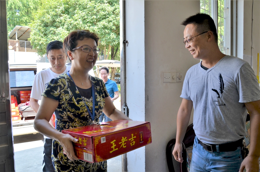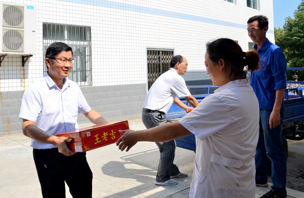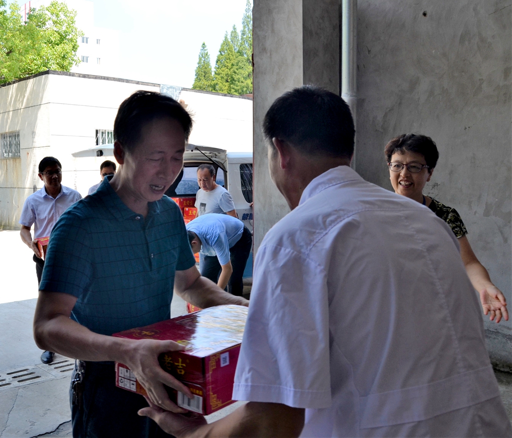 院领导将一箱箱防暑降温饮品送到员工手中,并与大家亲切交谈,详细地了解员工的工作环境和工作情况,感谢一线员工在炎炎烈日下仍然坚守工作岗位,耐心服务。