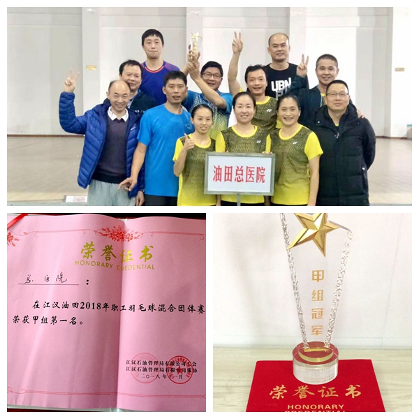 11月23日-25日,油田总医院羽毛球队参加了江汉油田2018年职工羽毛球混合团体赛,并勇夺甲组冠军!这是该院羽毛球队在油田组织的该项比赛中首次获得冠军。