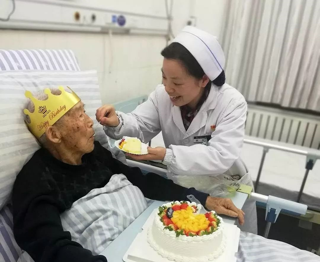 护士长张玉上前亲自喂老人吃下一口甜甜的生日蛋糕,她说,“能够在这么特殊的日子为百岁老人过生日,是一种缘分,也非常难得,祝愿李爷爷能够早日康复。”