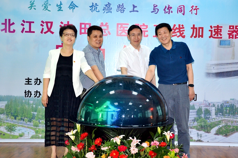 湖北省抗癌协会肿瘤放射治疗专业委员会主任委员胡德胜、油田总医院董事长胡望明、院长雷正秀、长沙建达投资管理有限责任公司总裁黄建湘共同上台开启水晶球。