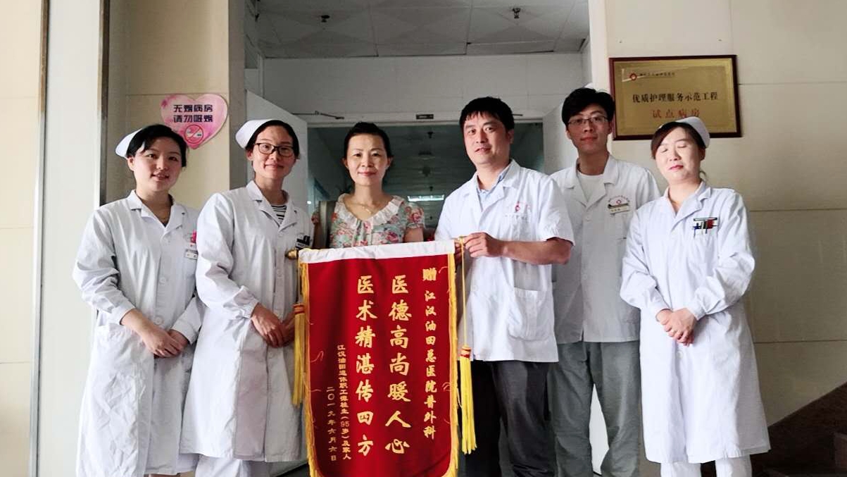 (图为谭爷爷家人为医护人员送来锦旗表达谢意)