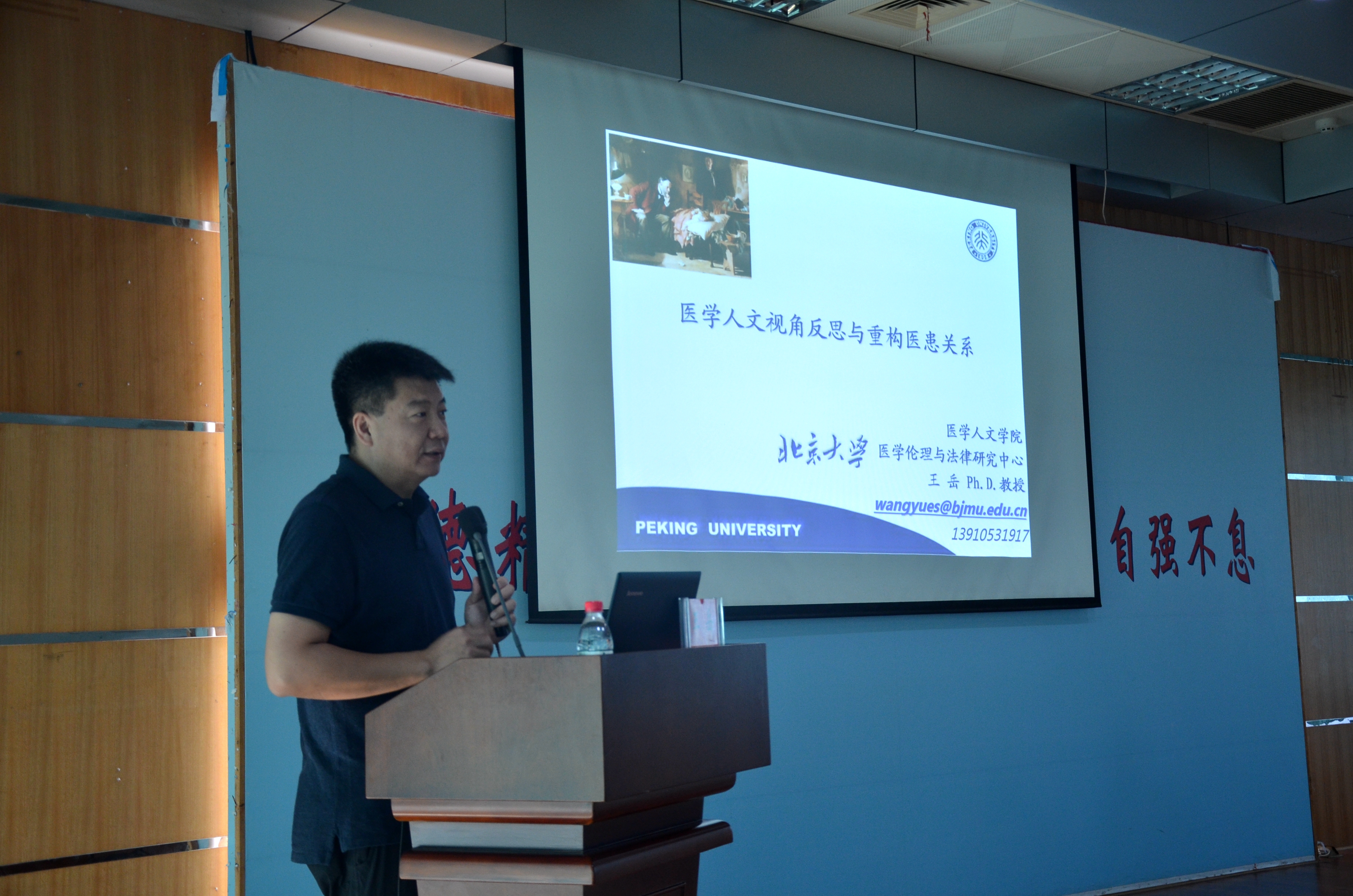 王岳教授从医患关系现状入手,引用经典案例和名人观点等对医学人文精神的三大元素:人本、仁爱、公益进行剖析,解析在医学人文视角下如何重塑新型医患关系。他认为,处理好医患关系,须用“三大元素”去克服医务人员的三大敌人:傲慢、冷漠、贪婪。人本就是要真诚地与病人沟通,从对方的最大利益进行选择;仁爱要求医生树立“病人至上”的理念,时刻牢记“病人好,我才好”;公益则强调懂得取舍金钱,有做人的底线。王岳说,改变思想,改变自己,把人本、仁爱、公益三大医学人文精神元素融入到工作中,掌握改变医患关系的主动权,从情感、心理上以全新的方式帮助病人,以此赢得患者和社会的尊重,实现医患和谐。