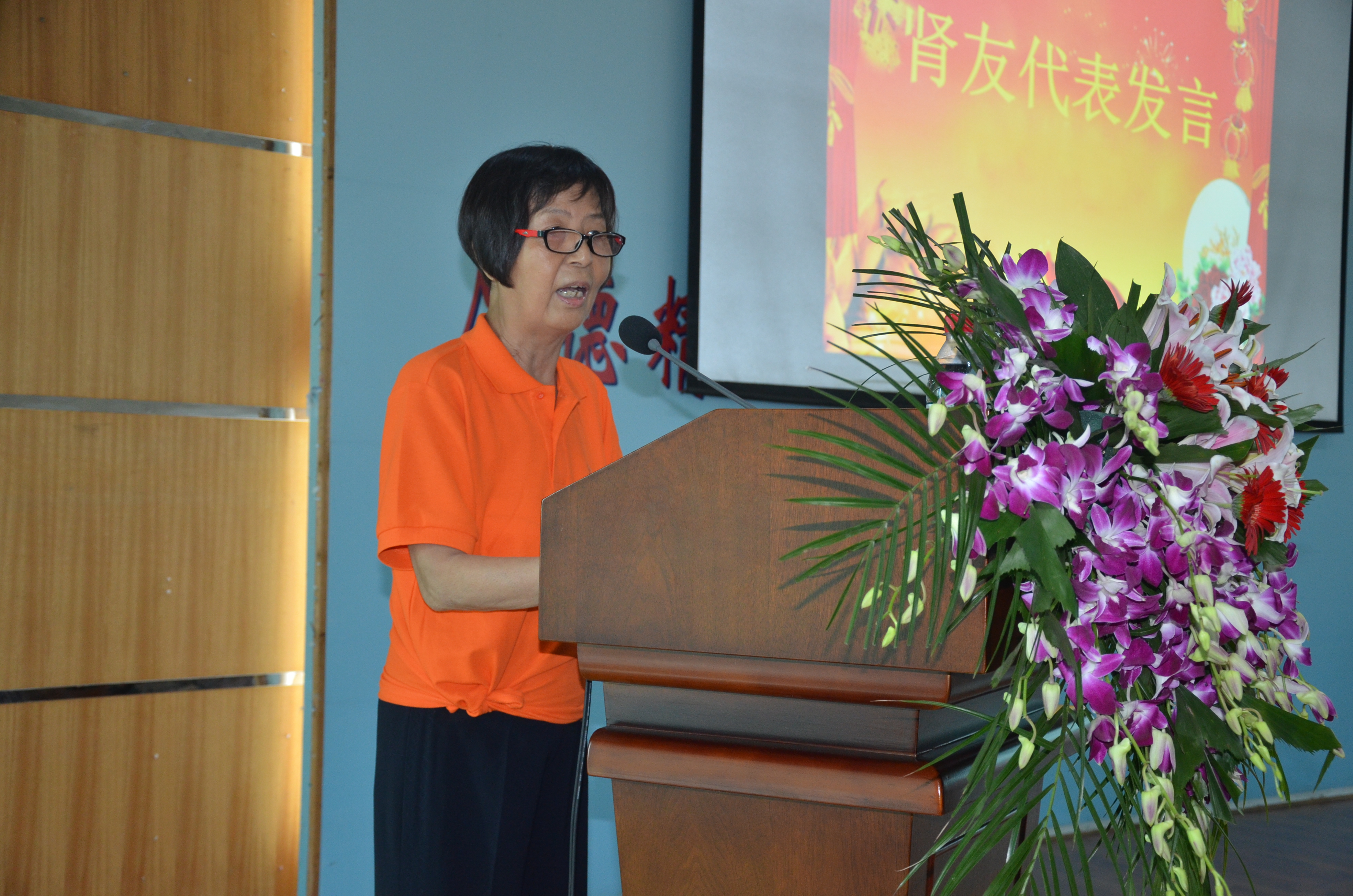 透析长达20年的肾友苏老师上台作为肾友代表发言。她讲到20年前,罹患尿毒症,2次肾移植失败,命若游丝,几度想要放弃,是护士长黄晓胜的鼓励和劝说让她重拾治疗的信心。20年来,更是总医院血透室医护人员精湛的技术、温暖的陪伴让她走到了今天。如今苏娅老师儿孙绕膝,家庭和美。科学的治疗帮助她开启美好的人生新旅程。