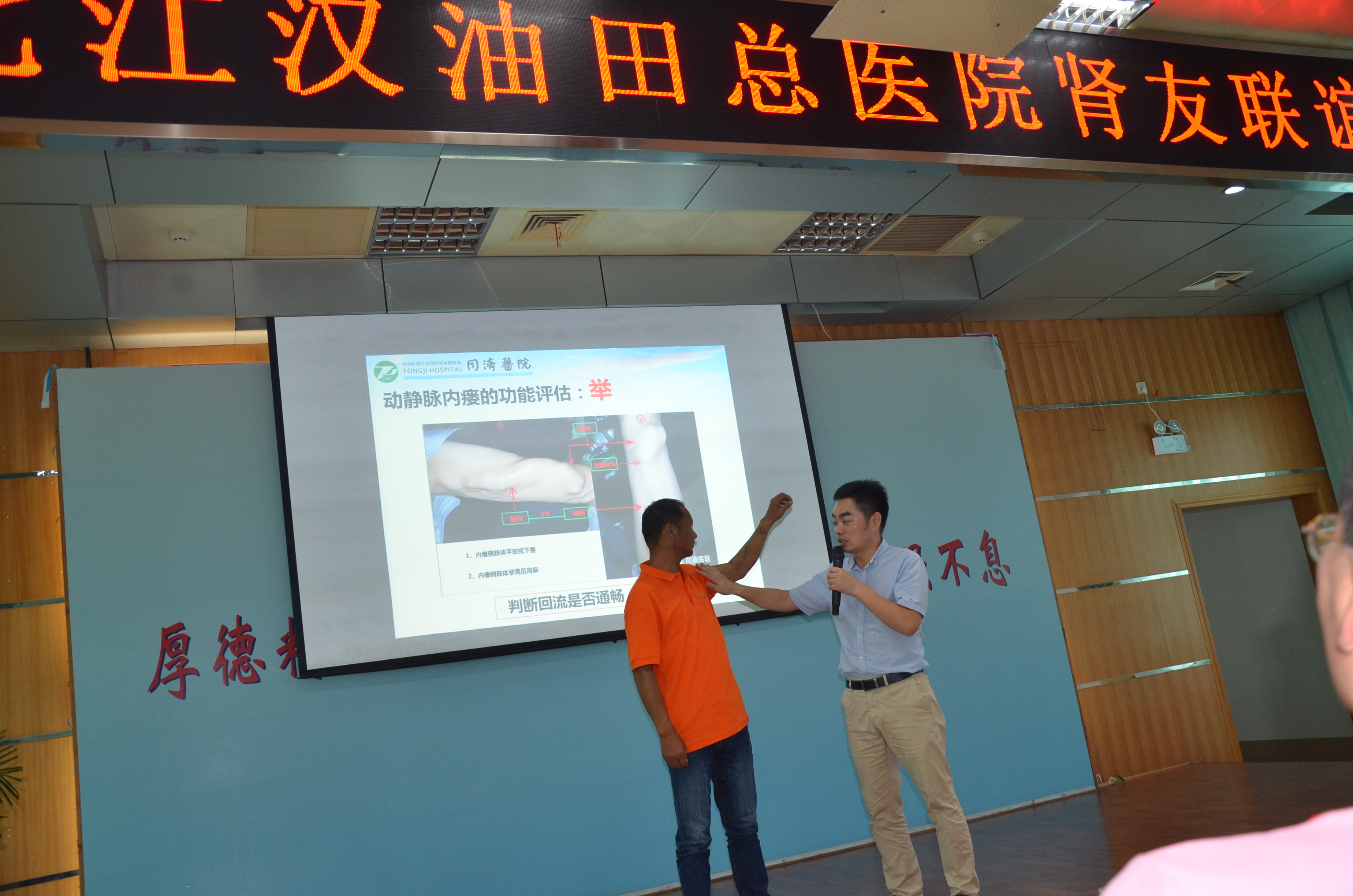 同济医院血液净化中心护士长鄢建军作《血液透析血管通路的监测与维护》专题报告。鄢护士长还现场和肾友互动,手把手教会肾友内瘘日常自我监测技巧:“看”“摸”“听”“掐”“举”。