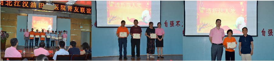 为了鼓励肾友们多年来与疾病顽强斗争的勇气,联谊会上,油田总医院还为透析5年、10年、20年的肾友分别颁发了透析榜样奖、透析强人奖、透析达人奖证书,希望广大肾友们也都能像他们一样,快乐透析,健康生活。
