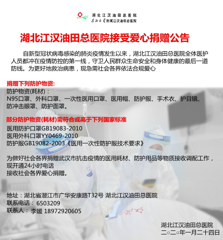 1月25日,湖北江汉油田总医院向社会发出“疫情专项爱心捐赠”公告,接受社会各界依法合规的爱心捐赠。