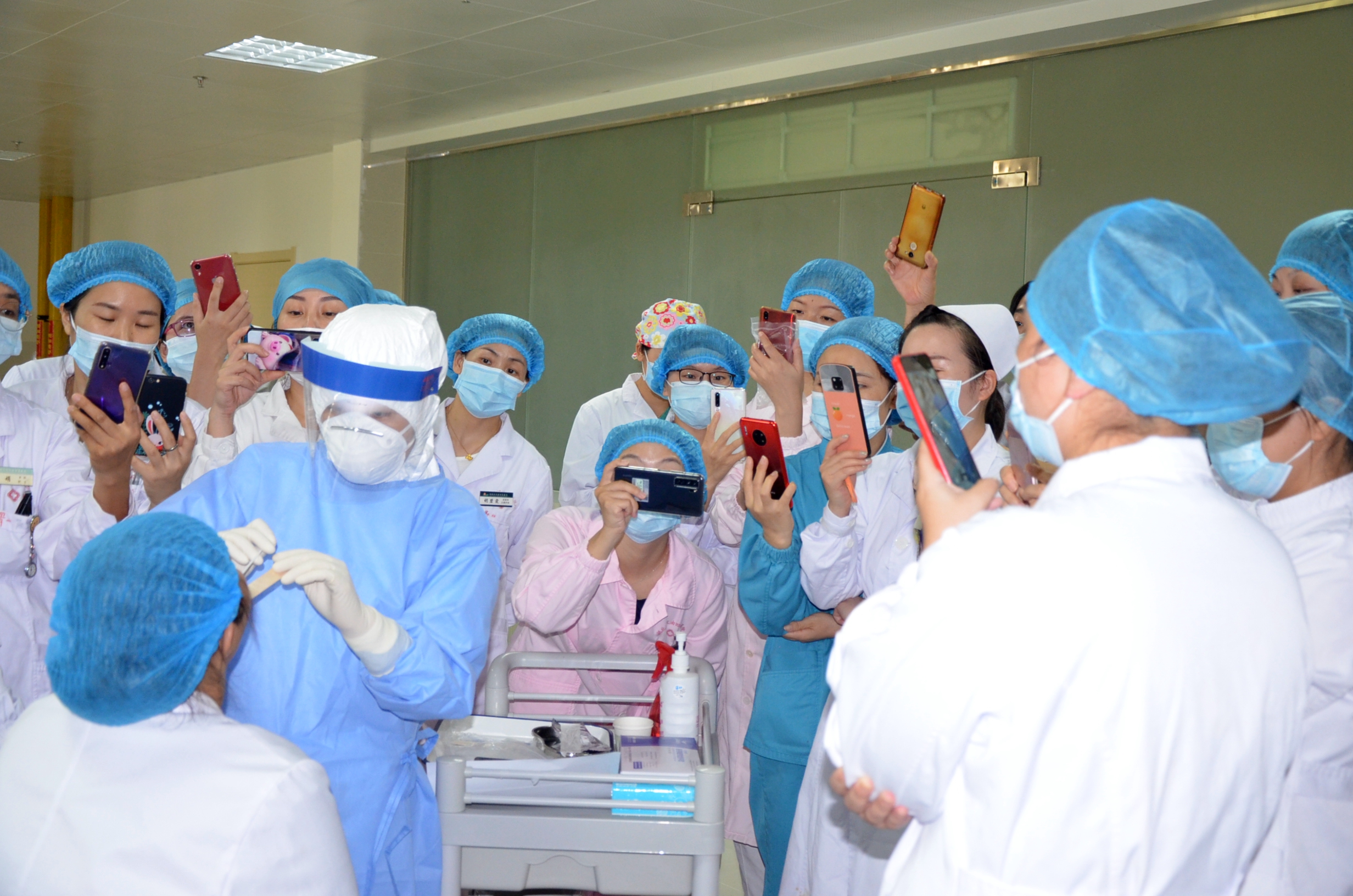 学员们在拍摄指导老师肖华演示咽拭子采集的规范动作