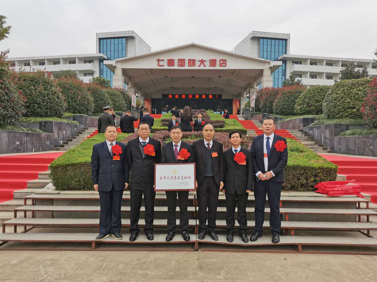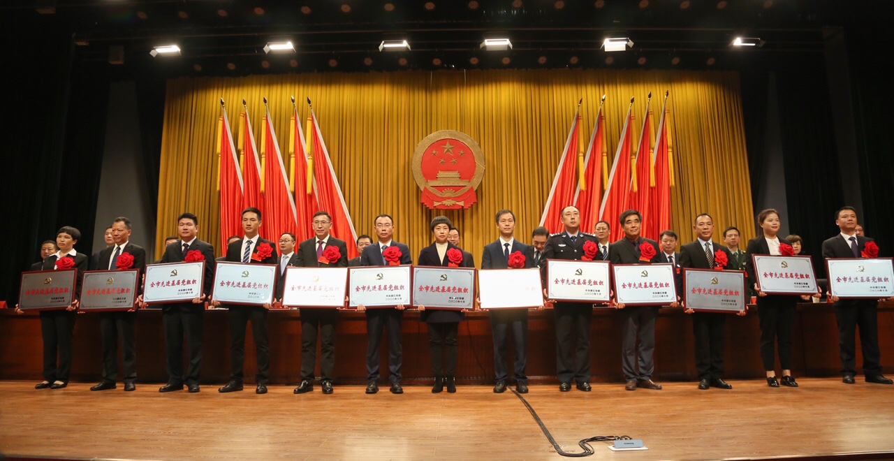 图丨中共湖北油田总医院委员会被授予潜江市先进基层党组织,院党委书记、董事长胡望明(左五)上台领奖。