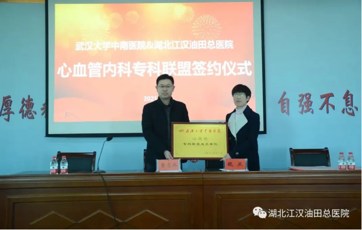 在热烈的掌声中,武汉大学中南医院心血管内科主任鲁志兵与油田总医院心血管内科副主任魏燕签署了专科联盟协议,并颁发了心血管内科专科联盟成员单位牌匾。