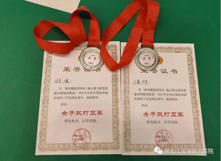 油田总医院职工王霞、徐苹在“2021年中央在鄂和省属企业职工羽毛球比赛”中获女双亚军