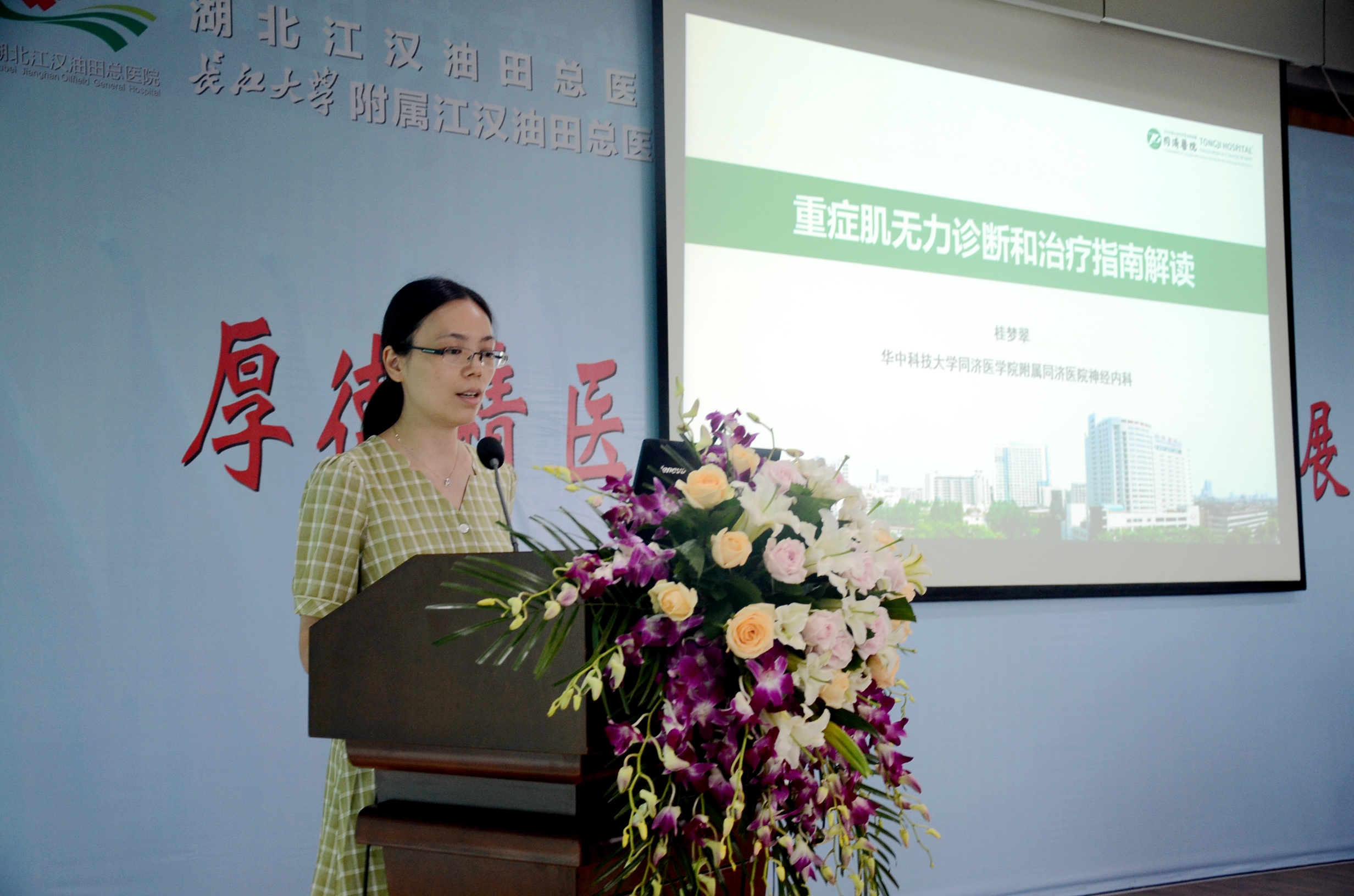 华中科技大学附属同济医院神经内科桂梦翠博士授课题目是“重症肌无力诊断和治疗指南解读”。她讲解了最新的指南在重症肌无力诊断和治疗上的更新点,具体阐述了这些更新点上两者之间的区别、新指南的亮点等。重点介绍了新增生物靶向制剂在MG治疗中的推荐,并具体介绍了相关药物。最后讲述了新增胸腺切除在非胸腺瘤MG治疗中的证据及推荐。桂梦翠博士的精彩授课为重症肌无力疾病诊断提供支持和帮助。