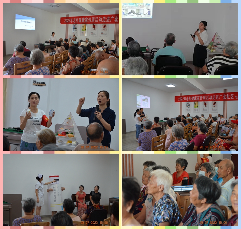 7月28日下午2:30,活动走进广北社区。护理部袁彩蓉主任讲授《老人防跌倒知识》,综合内科护士长范丽红讲授《老年营养健康知识》,来自消化内科和内分泌与肾病科的护士李胭、郑洁、胡杏、曹贵表演了健康科普情景剧《我是胰岛素》。