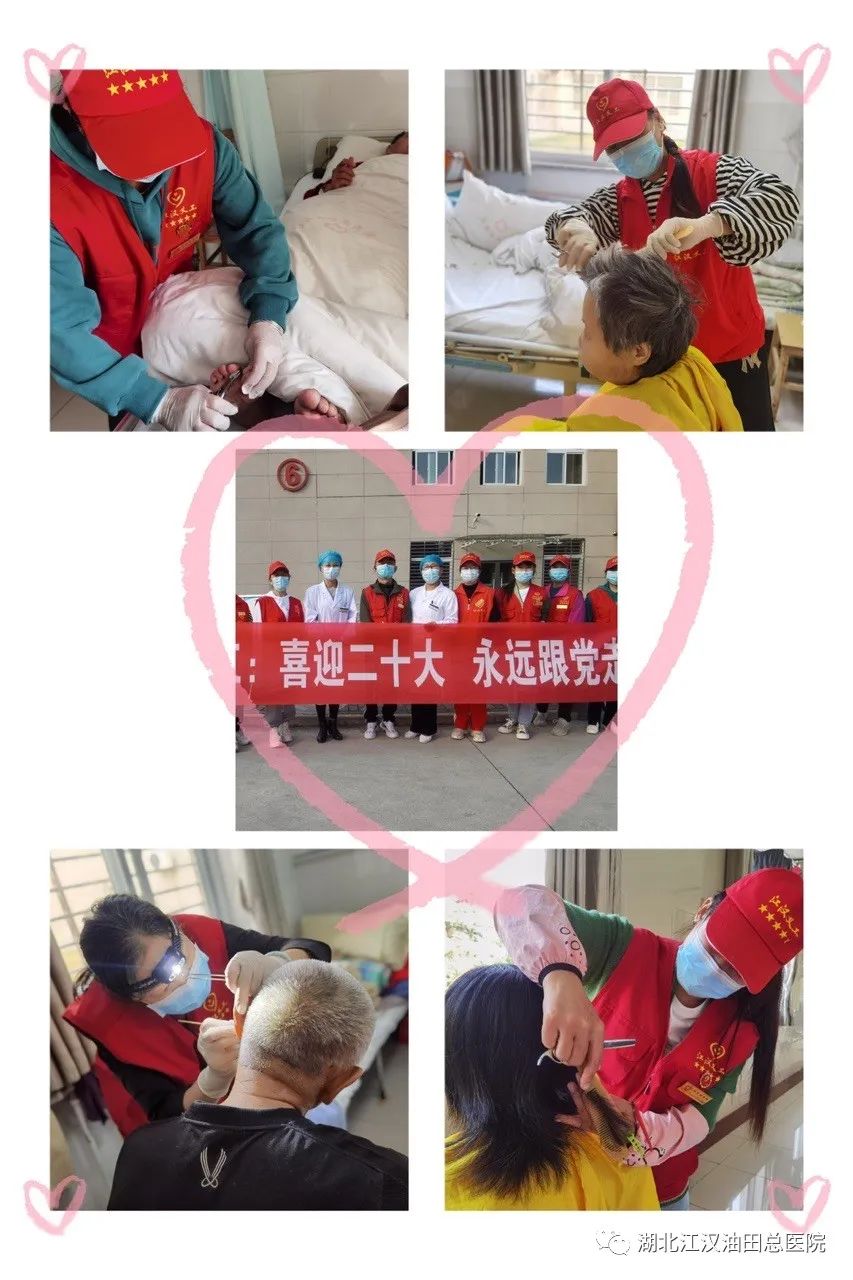 上图:志愿者们为患者理发、采耳、修脚剪指甲等,疏导患者的不良情绪,用暖心贴心的服务为患者送上诚挚的祈福,祝他们早日康复。