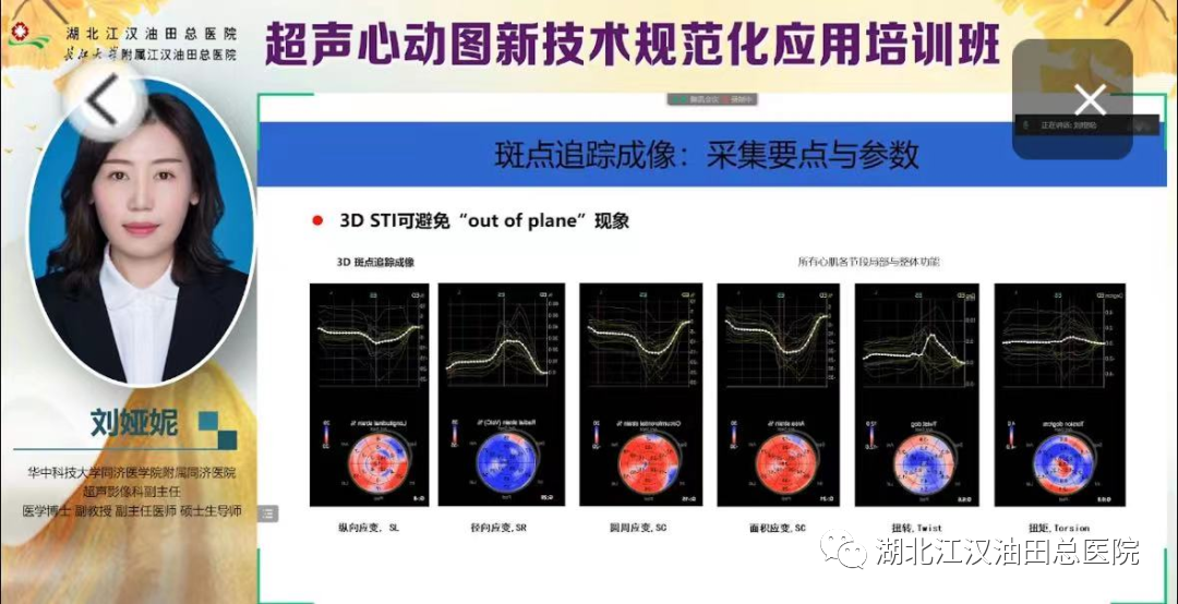 刘娅妮教授讲授了《斑点追踪成像新技术与临床应用前景》课题。对当前热门的心脏斑点追踪技术,从基本原理、采集要点参数来评价早期心肌收缩功能,并详细阐述了斑点追踪在临床的应用,让广大基层超声同仁深入了解这项新技术对于评估心肌整体和局部功能的可行性。她还重点介绍了斑点追踪AFI联合负荷超声提高识别缺血性心肌的敏感性,风险预测能力,总结2D/3D STI技术在心脏相关疾病中的应用,图文并茂,分享了大量病例.