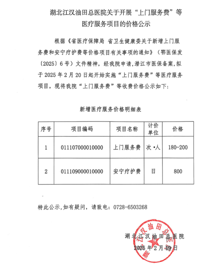 湖北江汉油田总医院关于开展“上门服务费”等医疗服务项目的价格公示