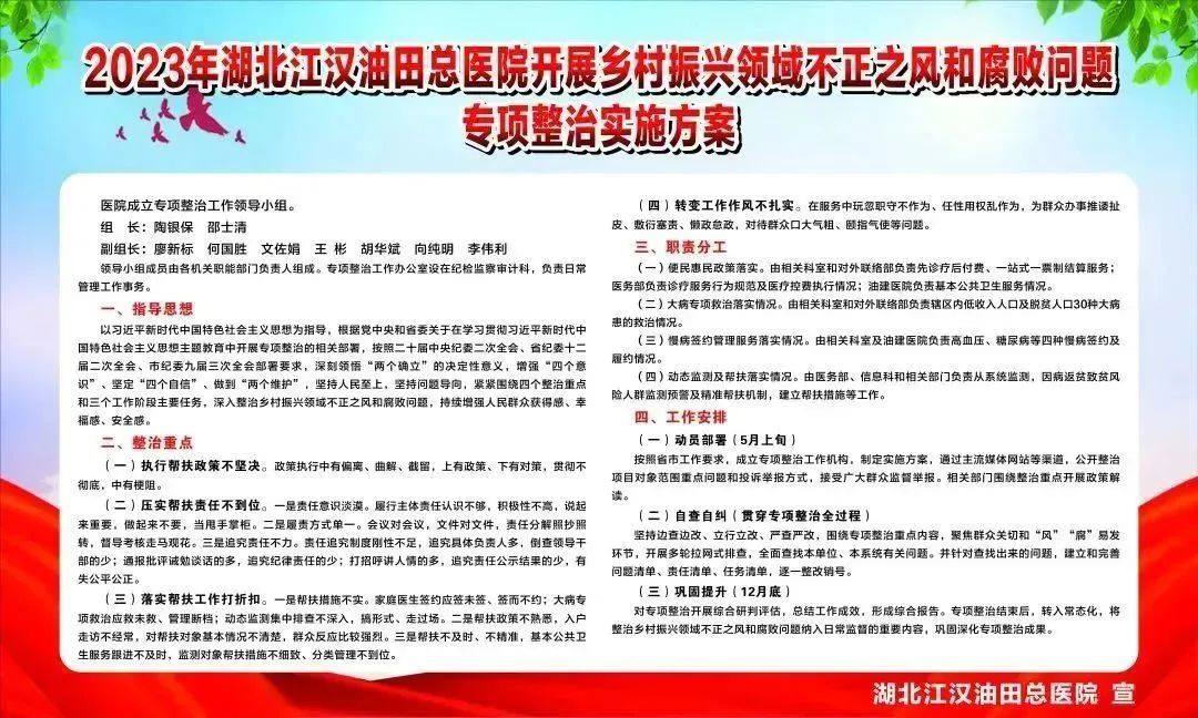 为全面推进乡村振兴,维护群众利益,深入贯彻落实省委、市委关于2023年乡村振兴领域不正之风和腐败问题专项整治实施方案的部署要求,湖北江汉油田总医院结合实际,坚持人民至上,坚持问题导向,即刻开展相关政策培训学习,各部门积极配合,细化整治内容,压实各级责任,将自查自纠和建章立制贯穿专项整治全过程,边查找边整改,狠抓整改落实。