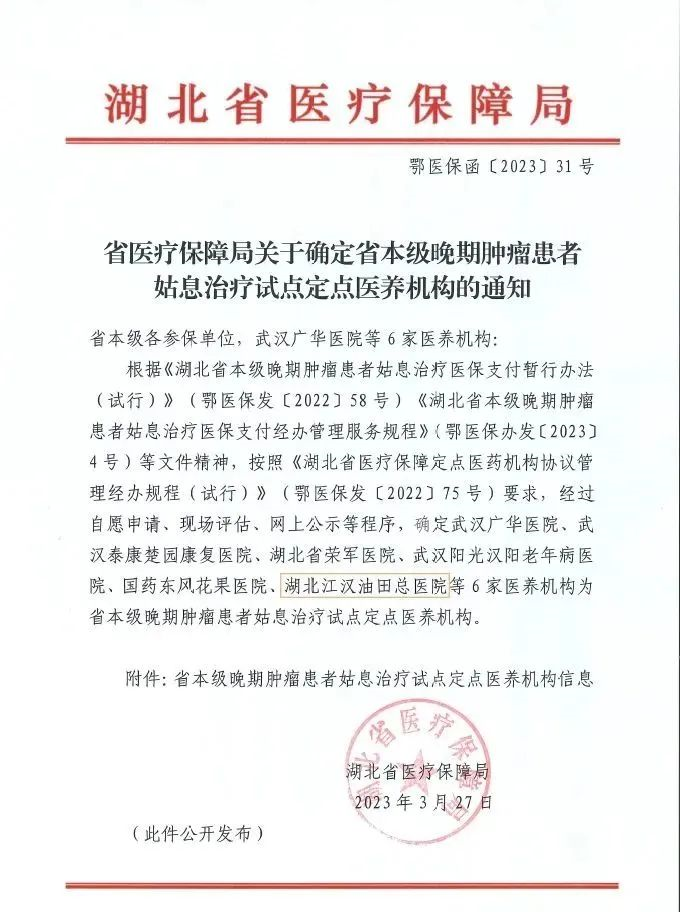 3月27日,湖北省医疗保障局公布省本级晚期肿瘤患者姑息治疗试点定点医养机构名单,湖北江汉油田总医院成为通过该评审的六家机构之一。