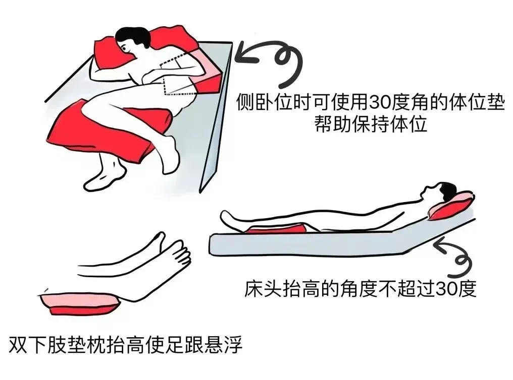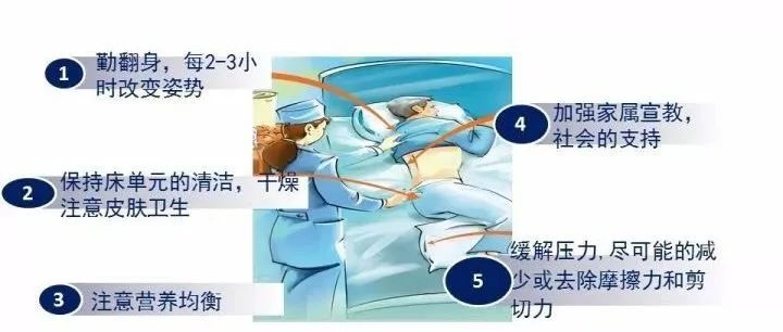 照护者通过体位变换来预防骨突处压疮,同时,要根据患者的具体病情、皮肤耐受度、移动能力和所用支撑面的特征来决定翻身的频率,翻身时应该抬起患者的身体,避免托、拉、拽。