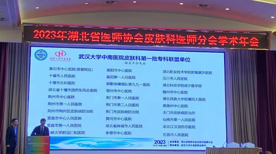 简讯二11月17日—18日,由湖北省医师协会皮肤科医师分会主办,武汉大学中南医院皮肤科承办的“2023年湖北省医师协会皮肤科医师分会学术年会”在武汉召开。我院被授予皮肤科专科联盟牌匾,正式成为武汉大学中南医院皮肤科专科联盟成员单位。