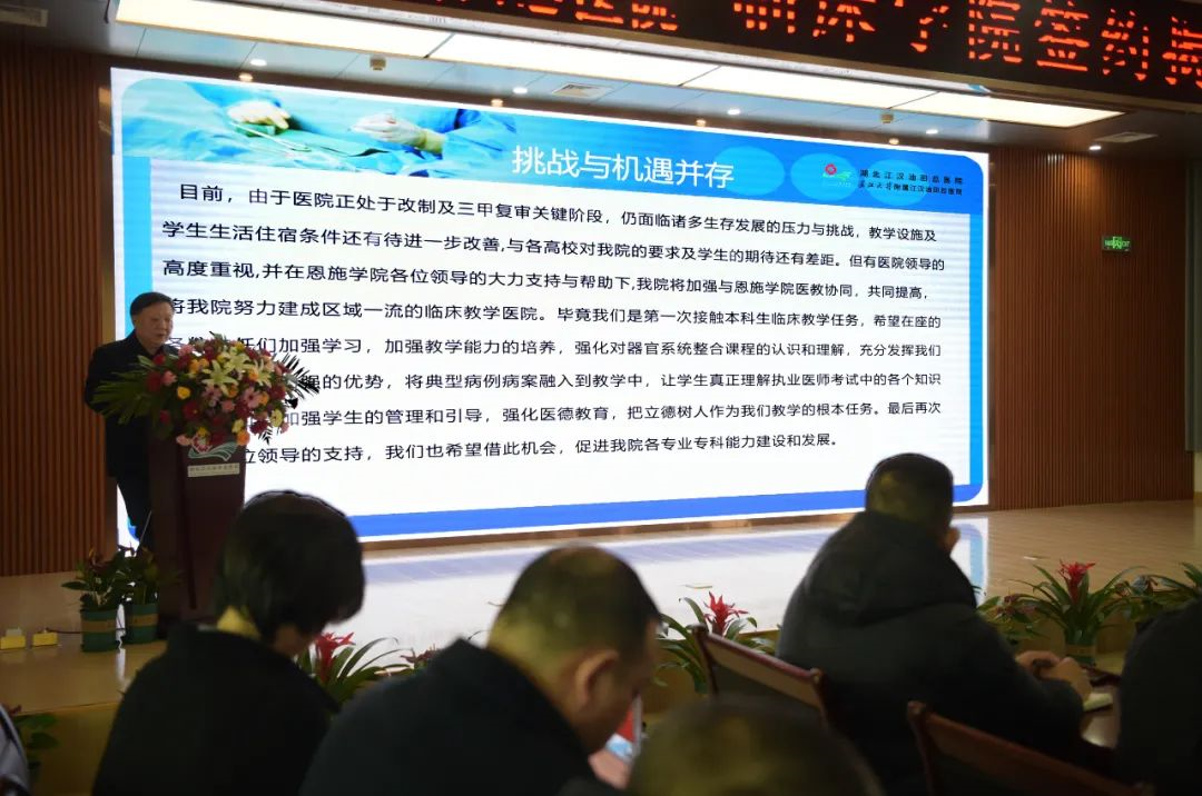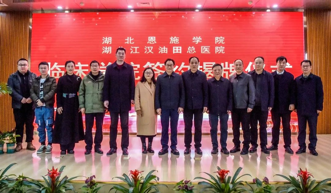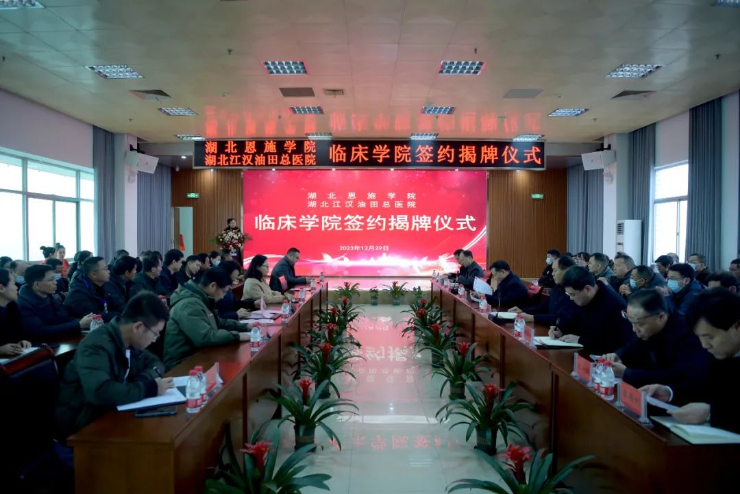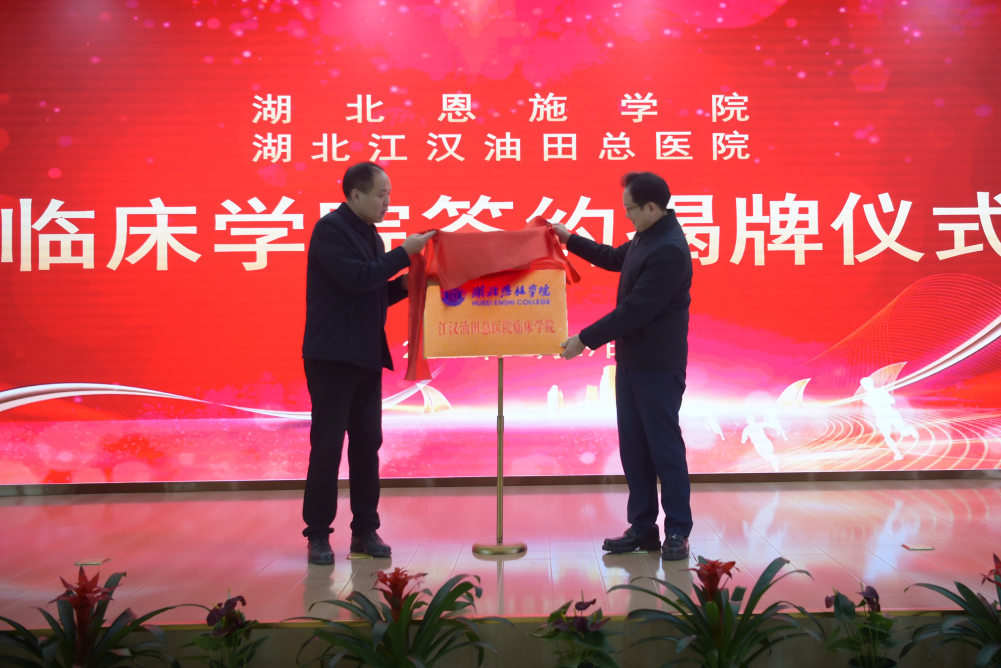 12月29日,湖北恩施学院与江汉油田总医院临床学院签约揭牌仪式在我院十二楼学术报告厅举行。恩施学院校长马凤余、我院党委书记院长邵士清出席揭牌仪式,医院领导班子成员、中层以上干部及职工代表、恩施学院相关领导参加了活动。