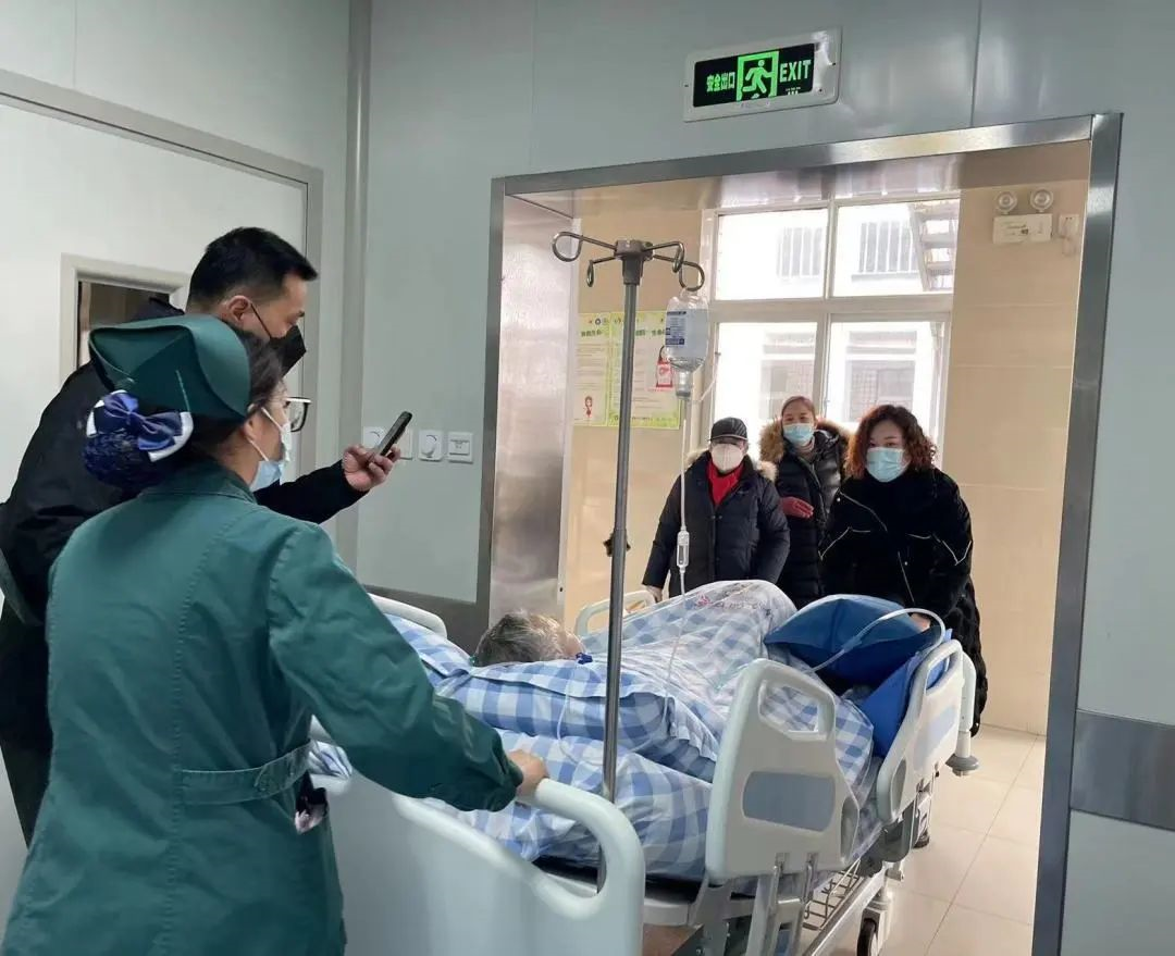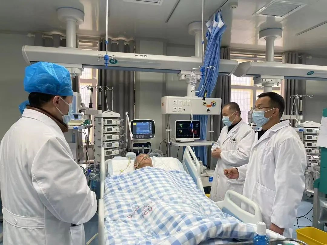 当日中午,患者栾老先生(化名)因消化道出血入住我院消化内科时,突发寒颤抽搐,心脏骤停。消化内科医护人员迅速对其展开施救并联系重症医学科(ICU)紧急会诊。5名医务人员不间断为患者实施心脏按压,成功让患者恢复心率,同时医护人员备好除颤仪、呼吸机等抢救设备于当日13点40分将患者通过快速通道转入重症医学科抢救。