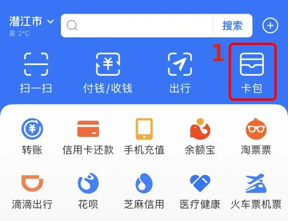 第一步:打开支付宝 APP,点击“卡包”