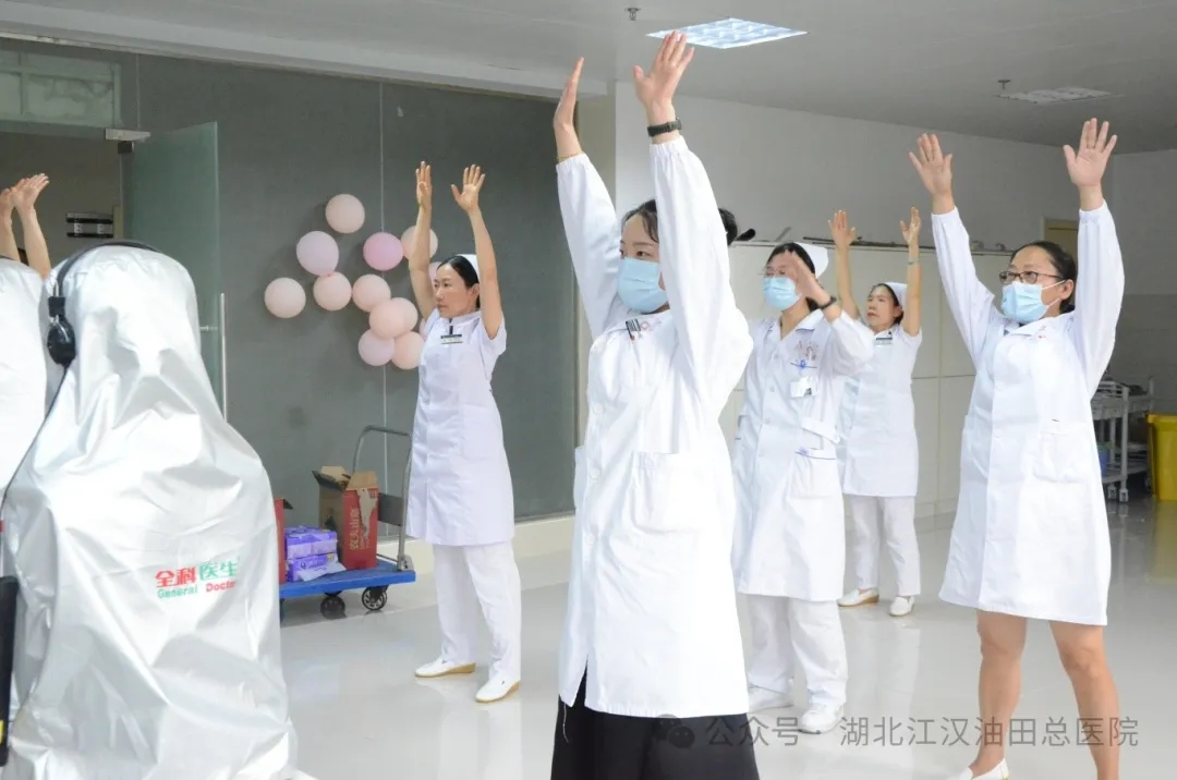 皮肤科护士长杨燕带领患者与医护人员一同进行八段锦的练习。
