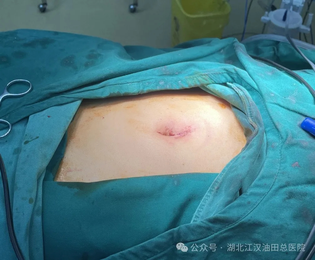 单孔腹腔镜手术是目前国际及国内前沿的微创技术之一。由于将传统腹腔镜手术由四孔、三孔、双孔改为一孔,所有操作器械都是经肚脐单一切口进入腹腔,操作空间狭窄,手术难度高,对于医疗团队的手术技巧要求更高。我院妇产科团队凭借丰富的腹腔镜手术经验和专业技术,在手术麻醉科医护人员的配合下,仅用十几分钟就为患者剥除了卵巢囊肿。术后患者腹部光滑如初,几乎看不出手术疤痕。