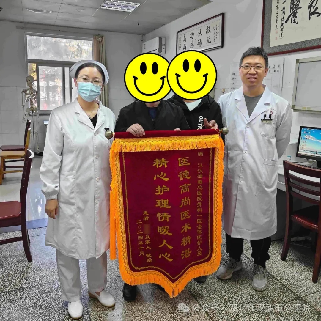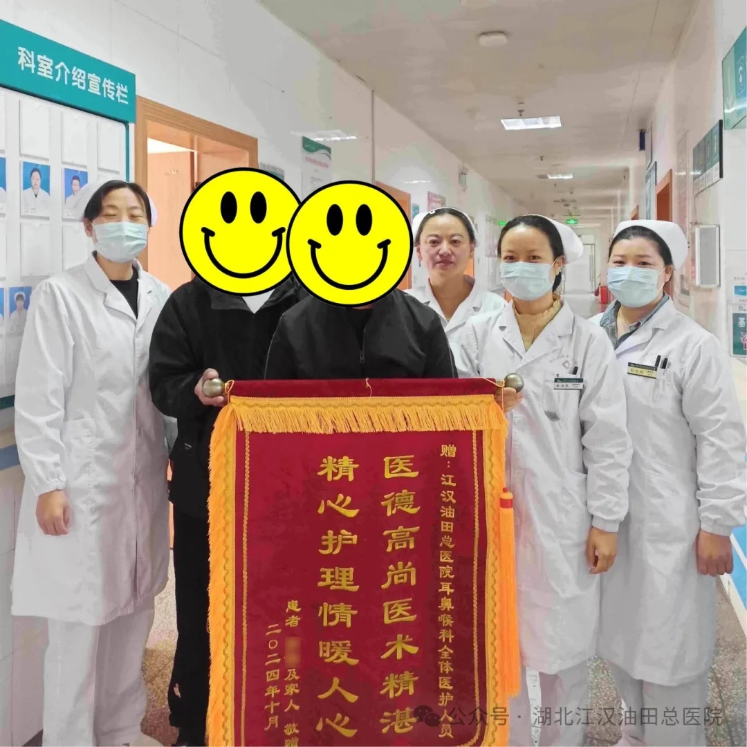 住院期间,医护人员的耐心与关怀令患者备受感动。出院后复诊,患者的状态也持续好转,声音不再沙哑。10月23日,患者专门来到医院,将两面锦旗赠与耳鼻喉科与骨科一区的全体医护人员。