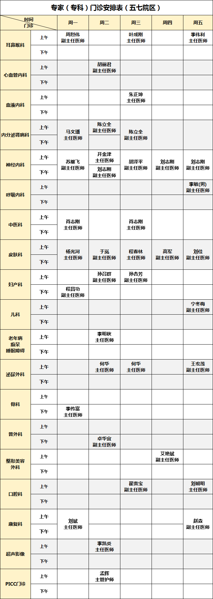 为方便患者安排就医时间,我院公布2026年1月5日-1月10日广华院区、五七院区专家(专科)门诊安排如下: